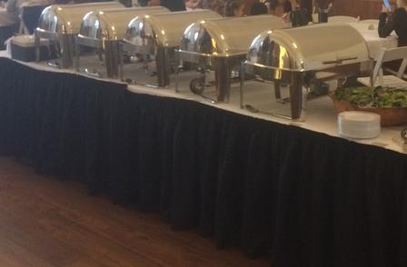 Includes real look disposable silverware rolled in a paper napkin, real look plastic dinner plate, real look plastic salad plate, pebbled glass beverage containers with iced tea, sweet tea and water, stainless steel coffee urns with regular and decaffeinated coffee, clear plastic cups for the cold beverages and real look plastic coffee cups. Includes stainless steel roll top chafing dishes, white table skirts and table clothes for the buffet and beverage tables. Two members of our staff to set up and maintain the food and beverages and help guests dispose of their dinnerware.